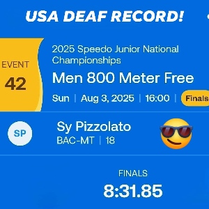 Team USA's Sy Pizzolato, swimming with Billings Aquatic Club, set the USA Deaf record in the 800 meter freestyle at the 2025 Speedo Junior National Championships with a time of 8:31.85. Pizzolato is on fire. Earlier this year he set USA Deaf short course records in the 500, 1000, and 1650 yard freestyle. Collin Davis, the previous USA Deaf record holder in the 800 free, will also represent the USA at the 2025 Deaflympics. The speedy duo of Davis-Pizzolato has been on the podium together before at the 2023 World...
