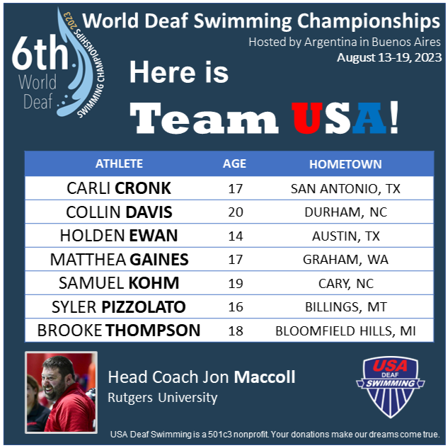 We are excited to announce Team USA for the 6th World Deaf Swimming Championships hosted by Argentina in August 2023. Congratulations to our athletes and Coach Maccoll. The Team will compete in grueling 7 days of completion which is expected to be attended by more than 30 countries. At the Deaf Olympics in 2022, the USA returned home with 55 medals -- 35 of which were won by our swimmers. We expect an equally exciting performance this year at Worlds!!