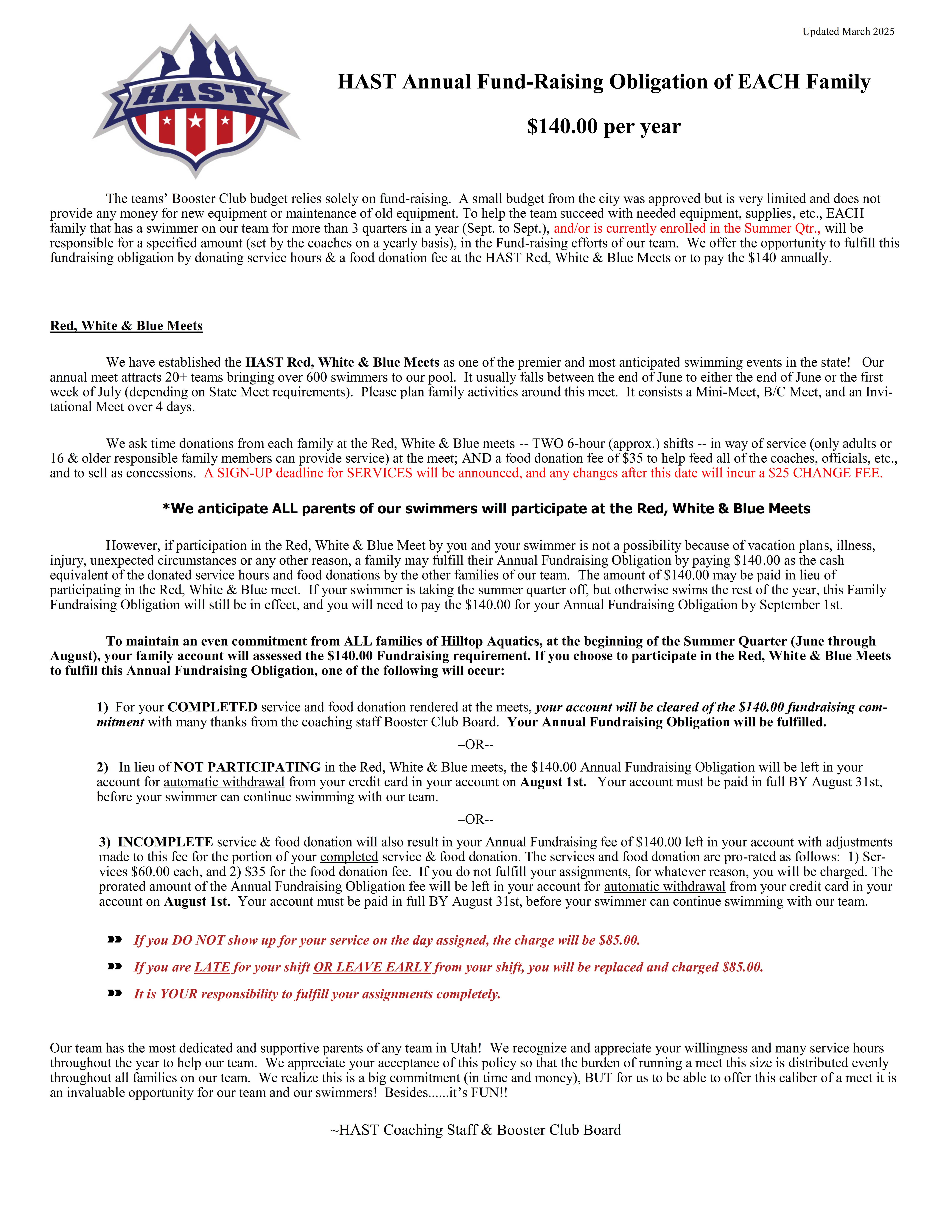 HAST- Parent Involvement at Meets & JOB Policies