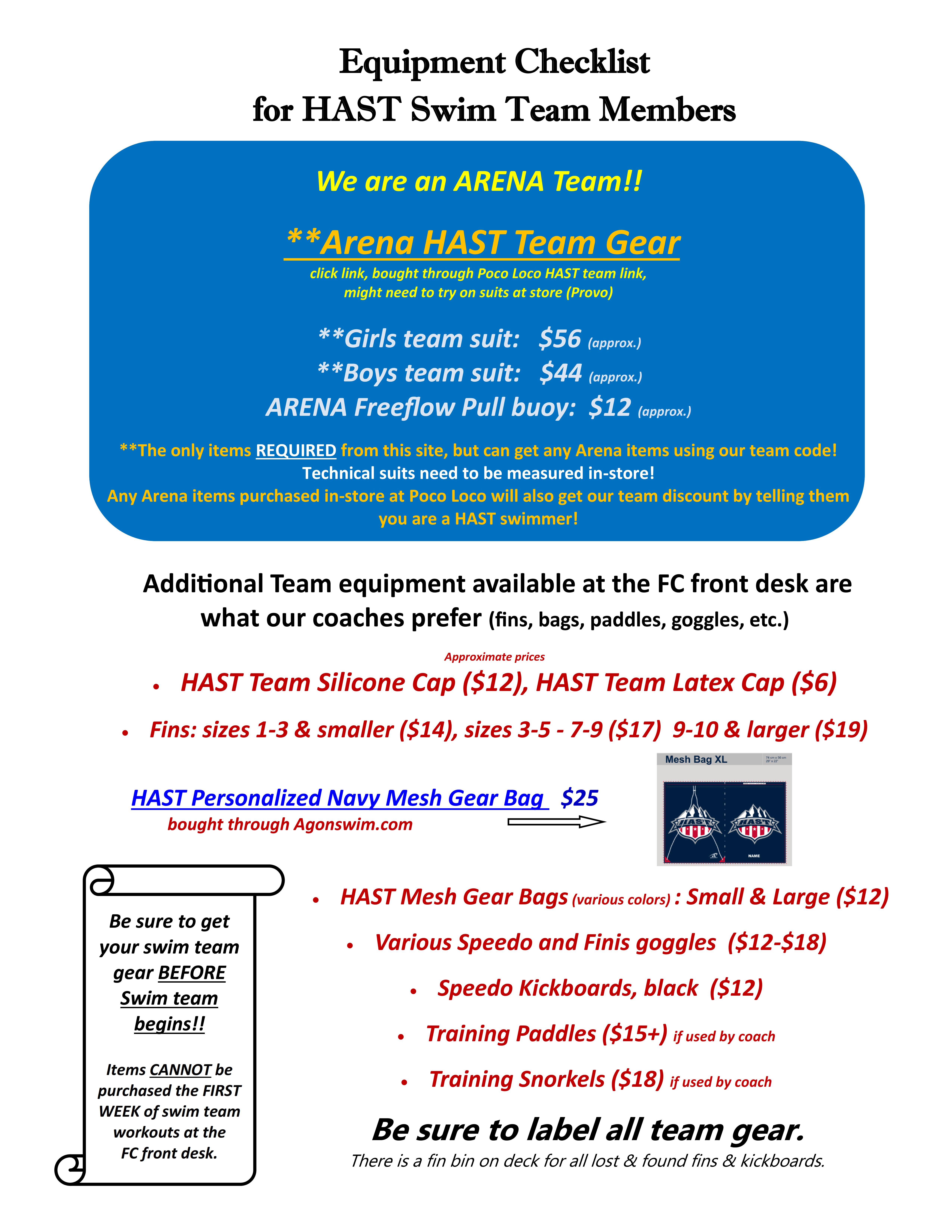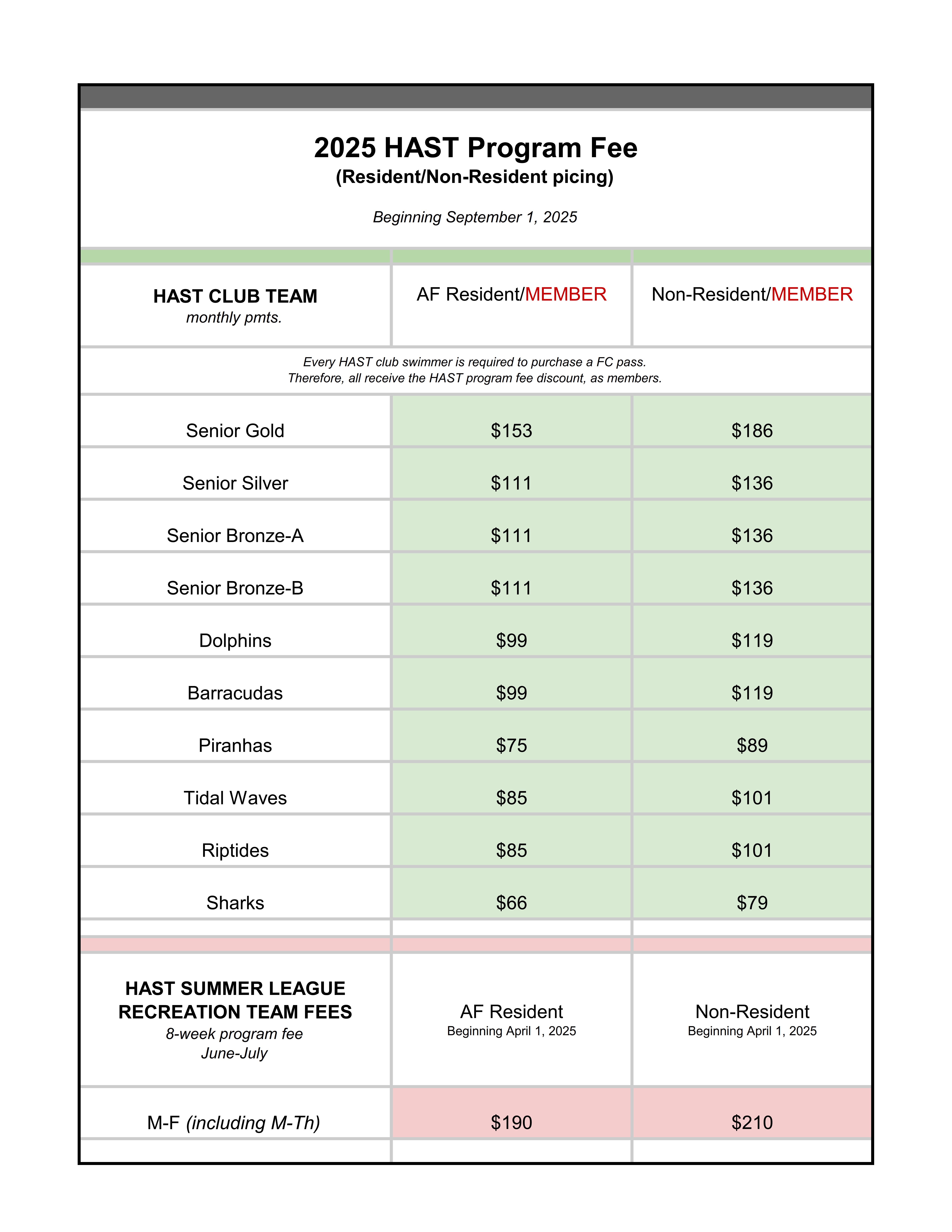 All Swimmers of our HAST year round club team must have a membership to the Fitness Center