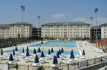 Three outdoor pools are available for use: a teaching pool (4 land, 25 yard), a 50-meter Olympic size pool, and a 1' deep children's wading pool. The swimming pool also has two 1-meter diving boards and two 3-meter diving boards.