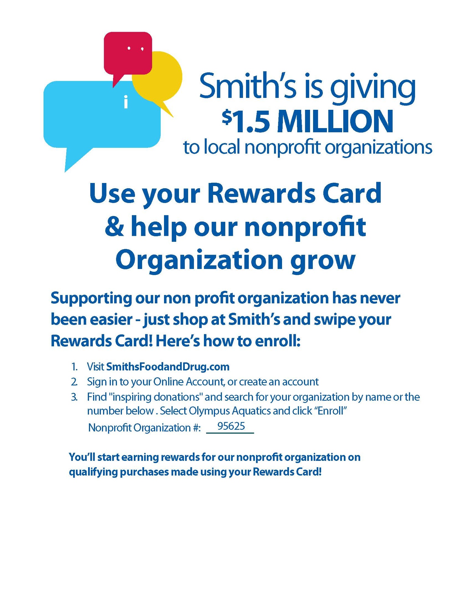 OA is enrolled in the Smith's Community Rewards Program. When families tie their account to OA, the team receives rewards money from Smith's on a quarterly basis. Please consider registering OA as the benefactor on your Smith's account. Enrollment is simple: just login to your account at https://www.smithsfoodanddrug.com/ and navigate to the inspiring donations tab under "My Account". Search for Olympus Aquatics by name or use our Non-Profit Organization (NPO) number 95625. Select "Olympus Aquatics" and click Enroll.