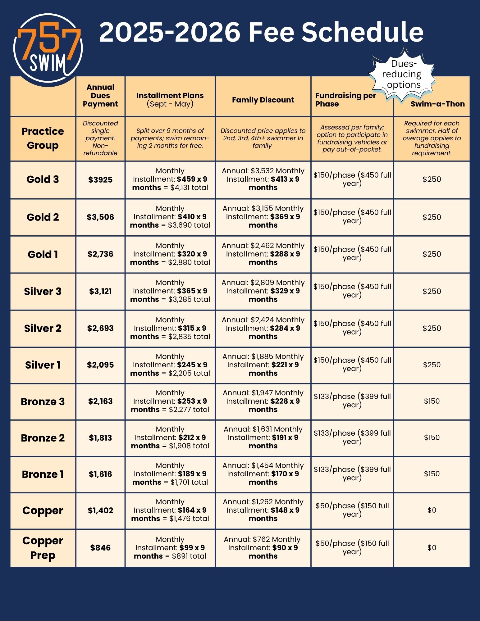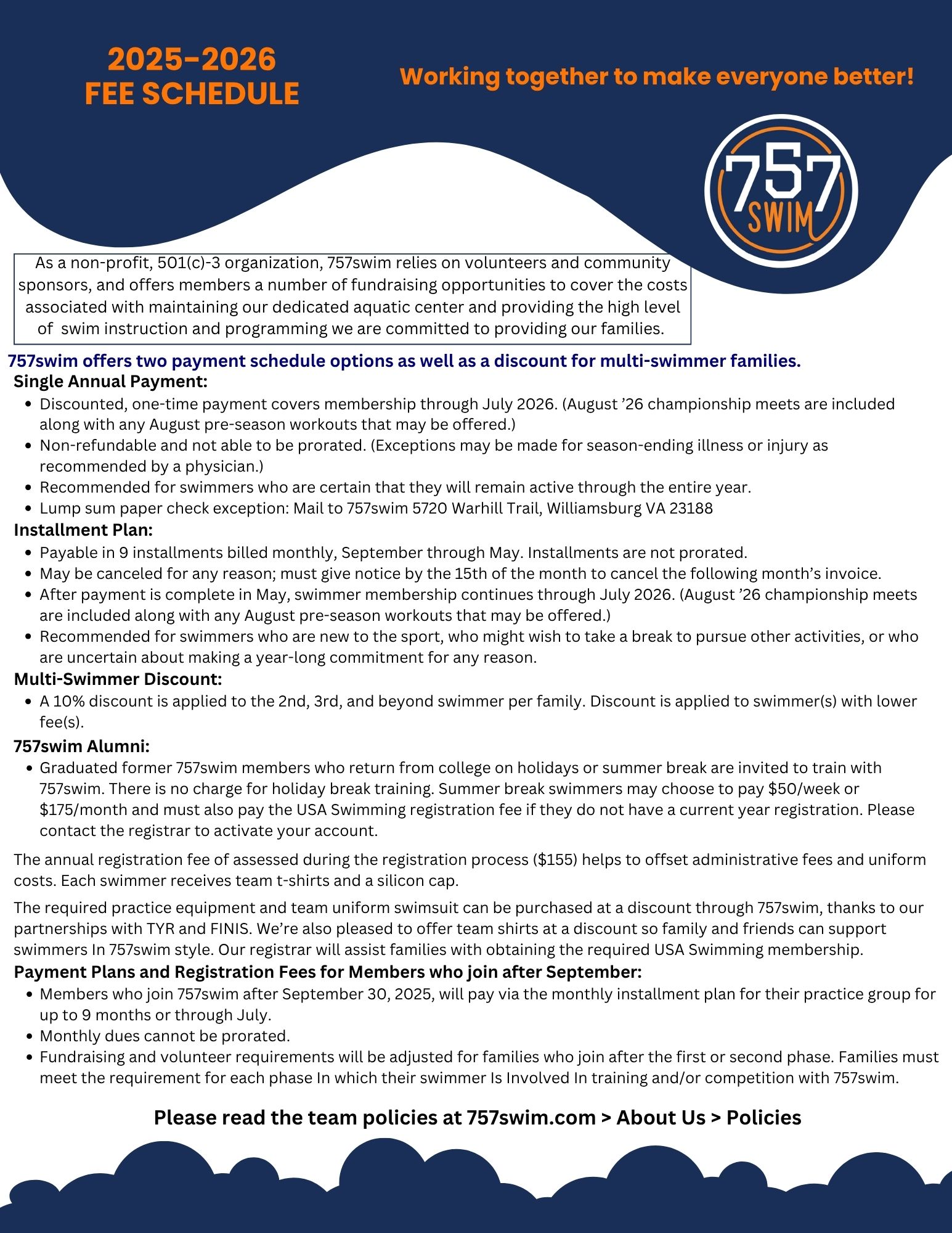 757swim is proud to offer top-notch swimming instruction in our dedicated Aquatic Center. In order to best meet the needs of all, we offer families the option to pay the full cost for their swimmer(s) or to offset costs through various fundraising vehicles. Please see our Fundraising and Volunteering page here for more information.