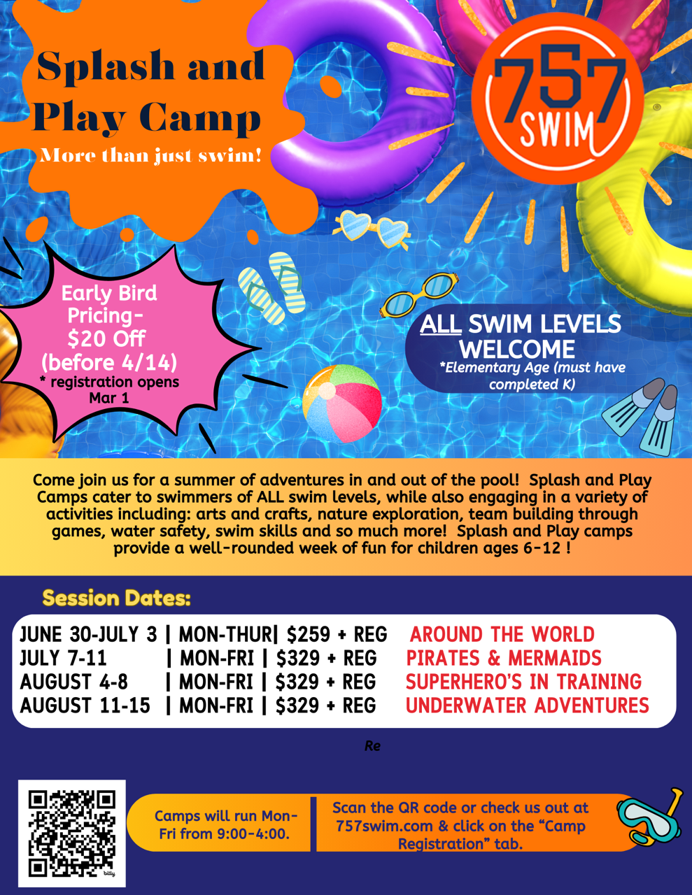 757swim is thrilled to offer another summer of camps for children ages 6-12. These camps are for swimmers of all ability levels and will include in-water instruction as well as outdoor fun. Please see the attached flyer for all the details. Space is limited, so tell your friends and neighbors now. Many of the camp sessions filled to capacity last year. We urge you to register early. REGISTRATION is NOW OPEN.