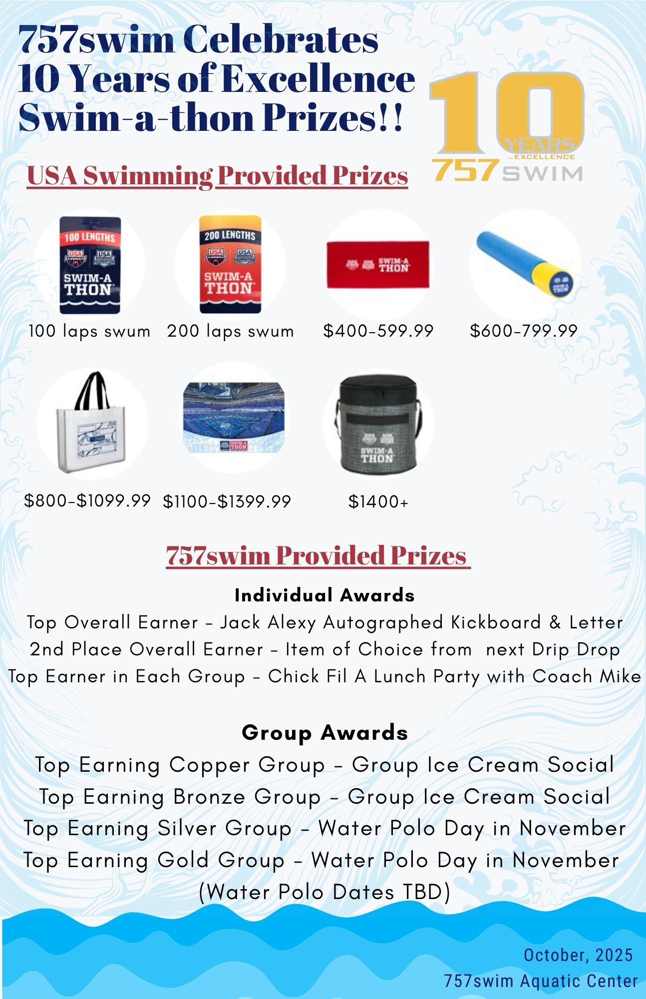 This year’s theme will be 10 Years of Excellence! The Swim-A-Thon is a required fundraiser for most groups and is a critical element in our budget. We set our annual dues with the Swim-A-Thon in mind. If we were not able to count on this fundraising, participating groups would be required to pay more each month. Certainly if you prefer for your child not to participate, you can pay out the required amount, but why not embrace the fun and reach out to family and friends to support and encourage your child while in the sport of swimming! Swim-A-Thon proceeds benefit the USA Swimming Foundation and projects like the recent locker room renovation and new practice equipment. To learn more about all things 757swim fundraising, CLICK HERE.
