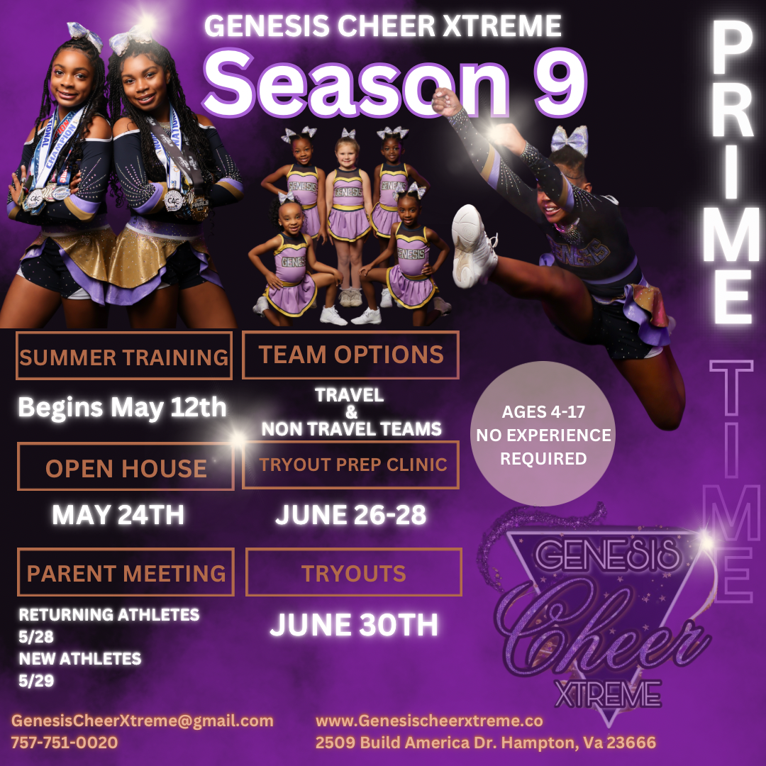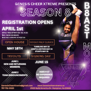 Genesis Cheer Xtreme is an All-Star Cheerleading program located here in the heart of Hampton, VA. We are a family-owned and operated business! GCX is a competitive cheerleading program, meaning we travel locally and regionally to different competitions to compete against other teams. Our mission here at Genesis Cheer Xtreme is to not only train and strengthen our athletes, but to build their character and teach them the value of teamwork, respect, integrity, hard work and dedication. We provide a safe environment where our athletes can be themselves without judgment. Because we are family-owned and every athlete is treated as such! Our goal is to simply create lifelong memories for every person that walks through our doors.