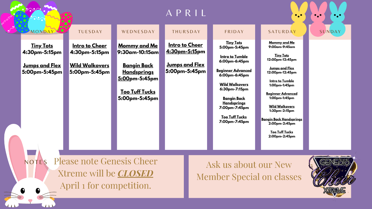 April classes are now live on GoMotion! Now's the time to get ready for tryout season! GCX will be closed April 1 for a competition. All 6 week new members, your athlete's class schedule is adjusted to reflect this. If you have any questions please do not hesistate to reach out to a GCX staff member. See you in class!