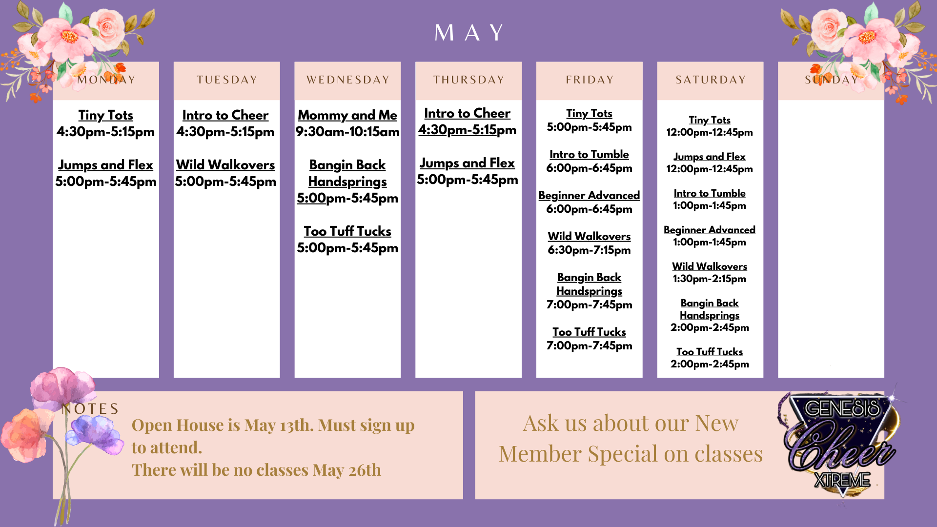 May classes are now live on GoMotion! We're a month away from Tryouts! Nows the time to get prepared! Ask about our private lessons, class packages and unlimited class passes!