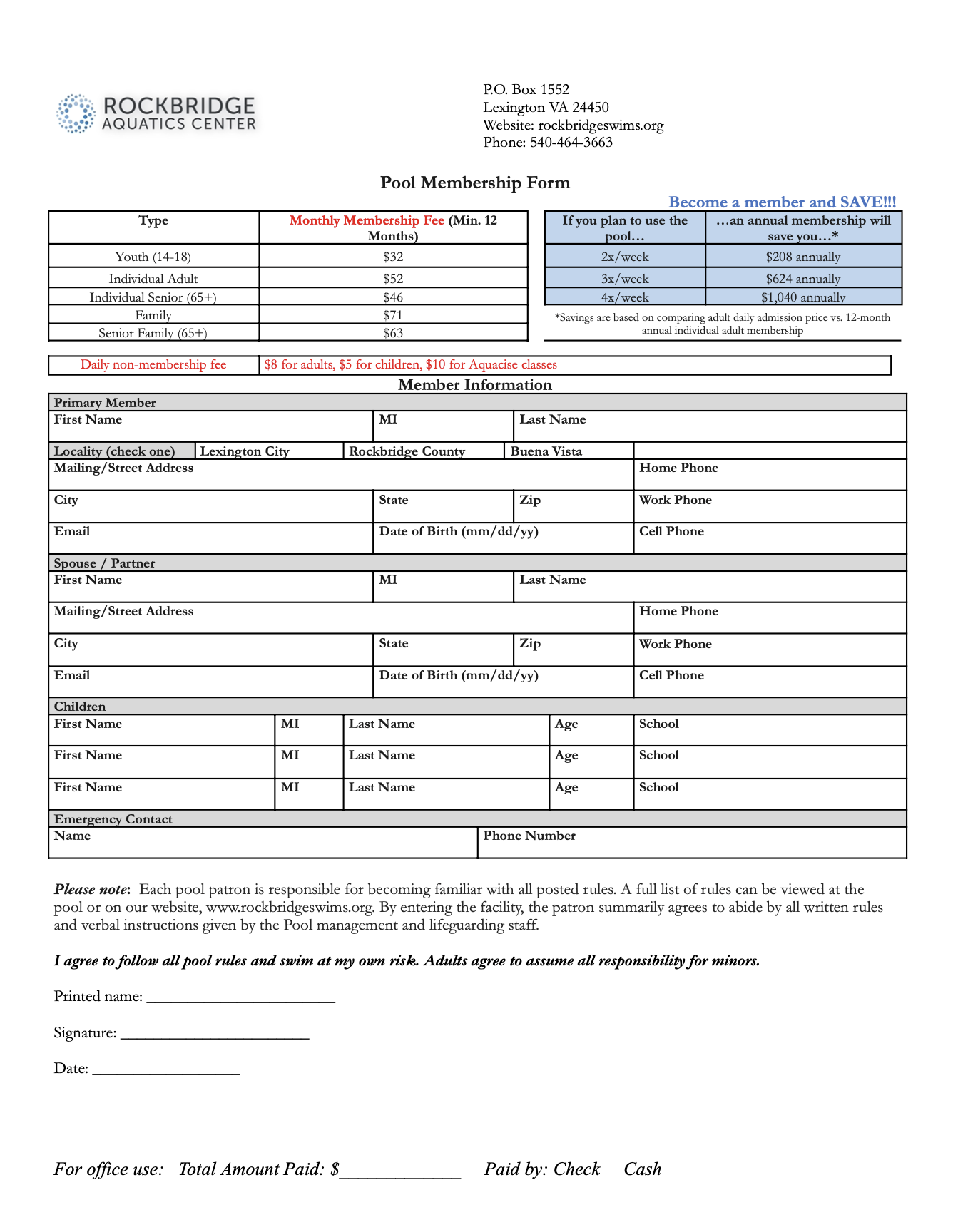 | Please see the below fee schedule for pool membership. At the bottom of the page you will find the membership form for download. To enroll in monthly bank drafts, be sure to complete both pages of the document. BENEFITS OF MEMBERSHIP *4 Free Private Lessons for Adult Members * Discounts on Swim Team registration * Discounts on Group Swim Lesson registration