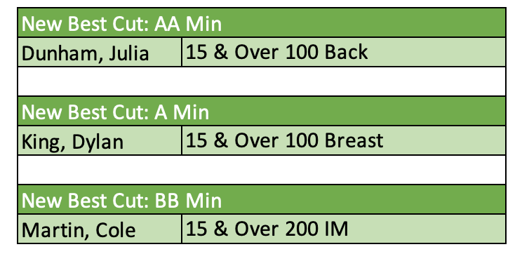 One swimmer, Sarah Dunham, made finals in two events, placing 6th in both the 50 Free and the 100 Back. Two other notable swims: Cole Martin dropped 8.58 seconds in the 200 IM, achieving a BB cut while Dylan King dropped over 5% in his 100 Breast, achieving an A cut.