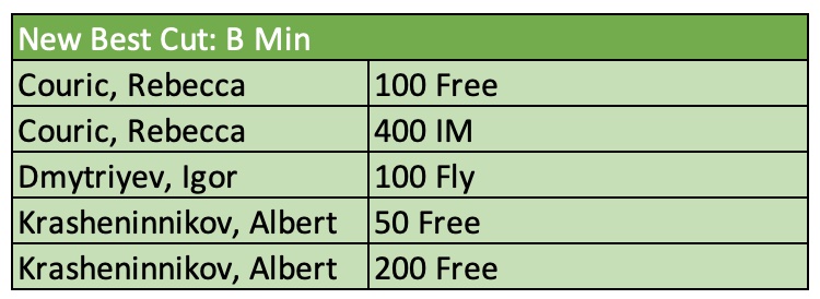 There were 31 new motivational cuts achieved from B through AAA. Those swims and swimmers are called out below. Great meet, everyone!! We hope you all had fun and were encouraged by your times over the course of the weekend and can't wait to see your end-of-season swims at both Age Group and Senior Championships in July!