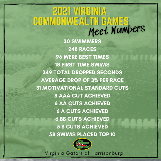 From June 25 - June 27, thirty of our swimmers traveled to Lynchburg, VA for the Virginia Commonwealth Games (long course) - another great team turnout for our kids! This was a prelims/finals long course meet held at Liberty University. Our team swam a total of 248 events over the course of 3 days, and 18 of these races were first time swims and 96 were best times!