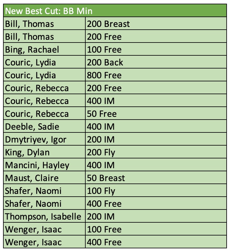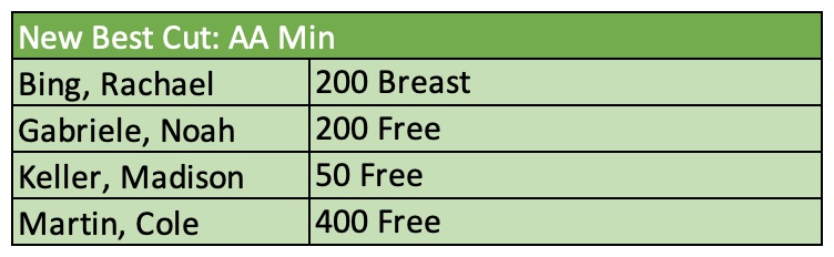 There were EIGHTY-SEVEN new motivational cuts achieved from B through AA. Those swims and swimmers are called out below. Great meet, everyone!! We hope you all had fun and were encouraged by your times over the course of the weekend. See you during the 2021-22 Short Course season.