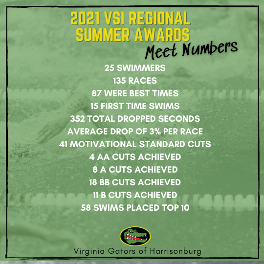 From July 9 - June 11, twenty-five of our swimmers traveled to Christiansburg, VA for the VSI Regional Summer Awards Meet (long course) - our last open meet of the long course season before championship meets begin. Our 25 swimmers swam a total of 135 events over the course of 3 days, with a whopping 87 best times! Fifteen of these races were first time swims.