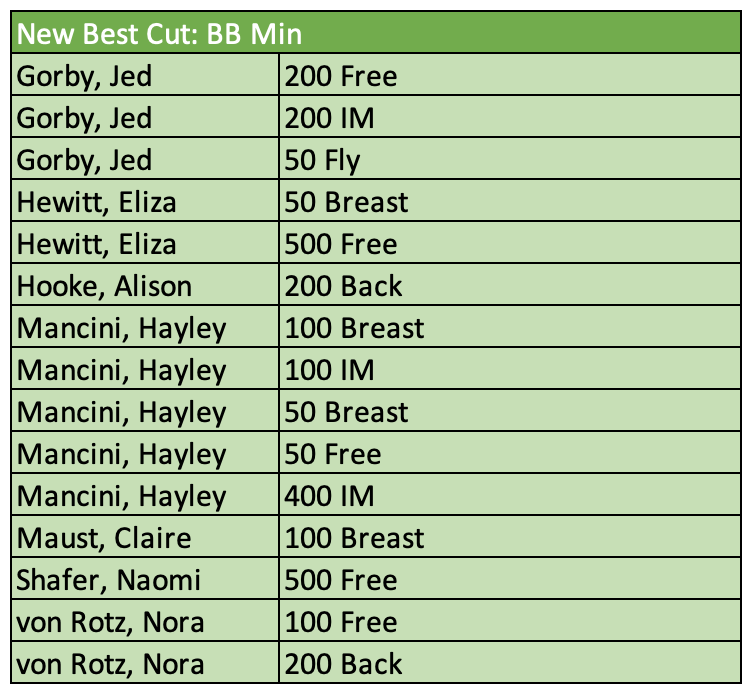 There were 45 new motivational cuts achieved from B through AAA. Those swims and swimmers are called out below. Great meet, everyone!! We hope you all had fun and were encouraged by your times over the course of the weekend.