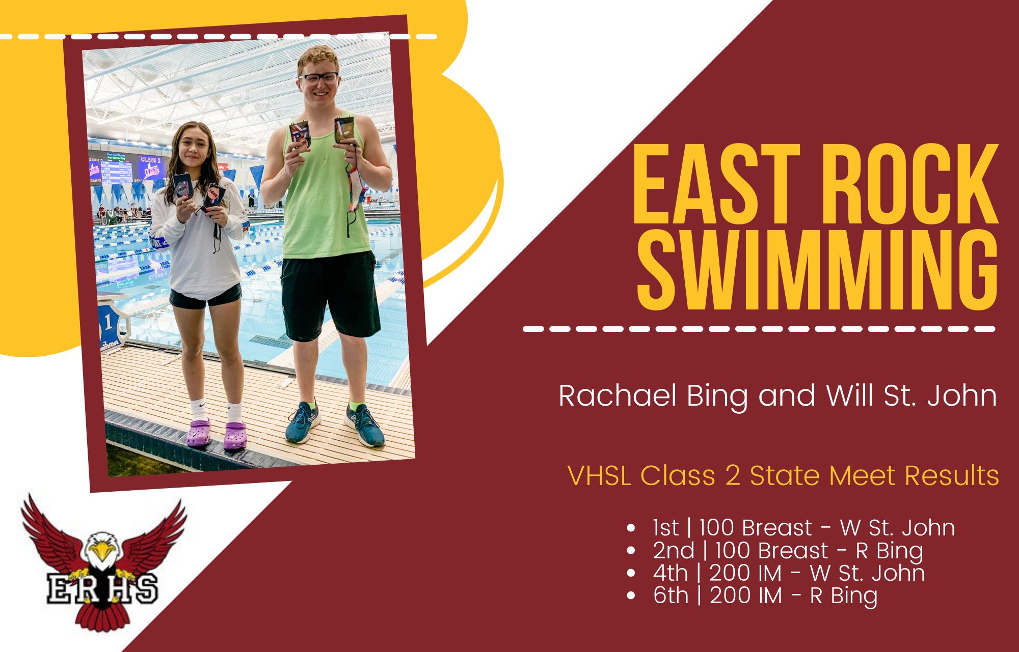 Rachael Bing and Will St. John represented East Rock High School (w/ coach Haley Saunders). Rachael and Will had personal best times for their events and also placed in the top eight for the VHSL Class 2 State meet.