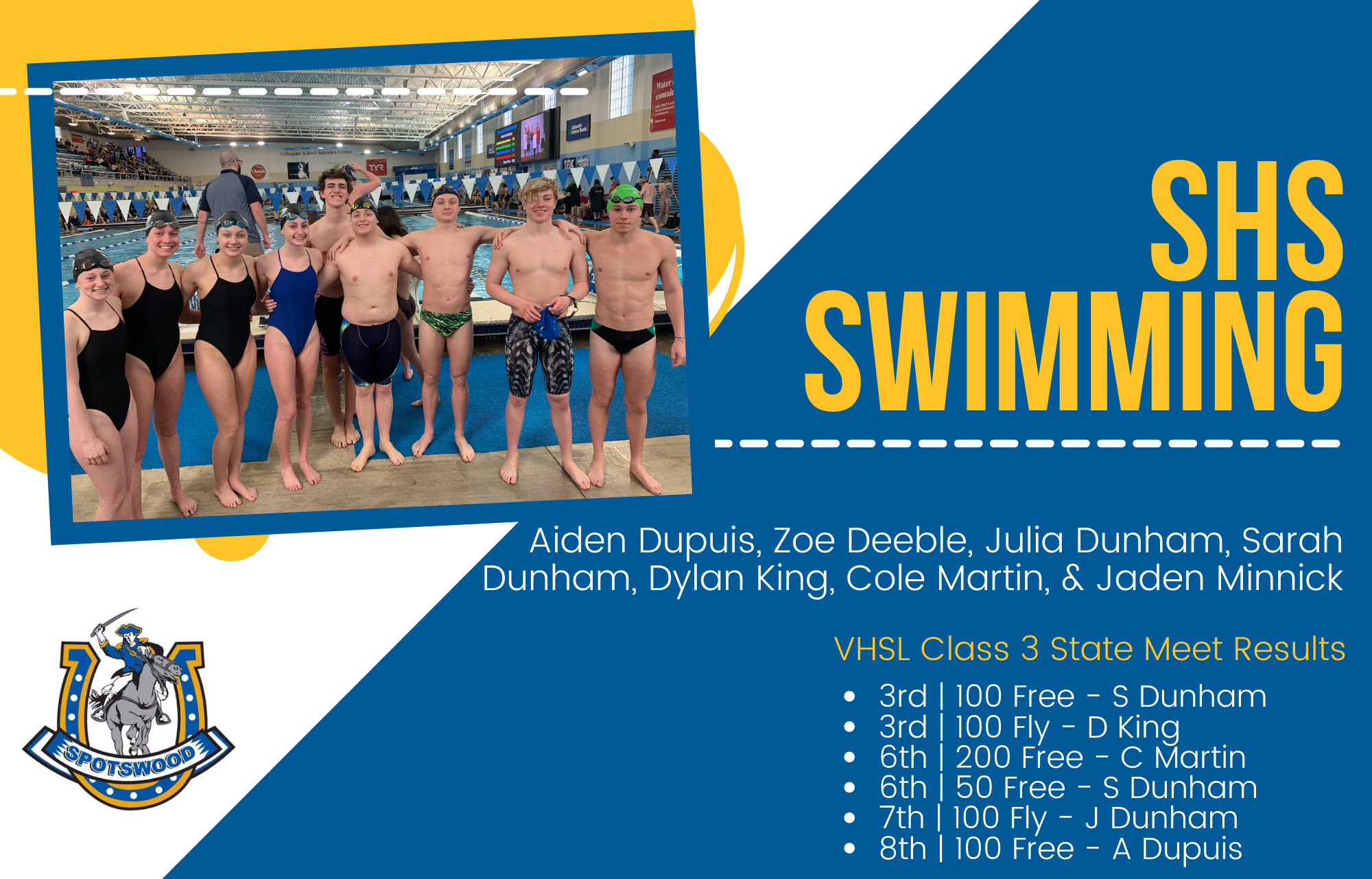 Spotswood High School was represented by Aiden Dupuis, Zoe Deeble, Julia Dunham, Sarah Dunham, Dylan King, Cole Martin, & Jaden Minnick (w/ coach Haley Saunders). The * next to a name notes a personal best times for swimmers competing in the VHSL Class 3 State meet.