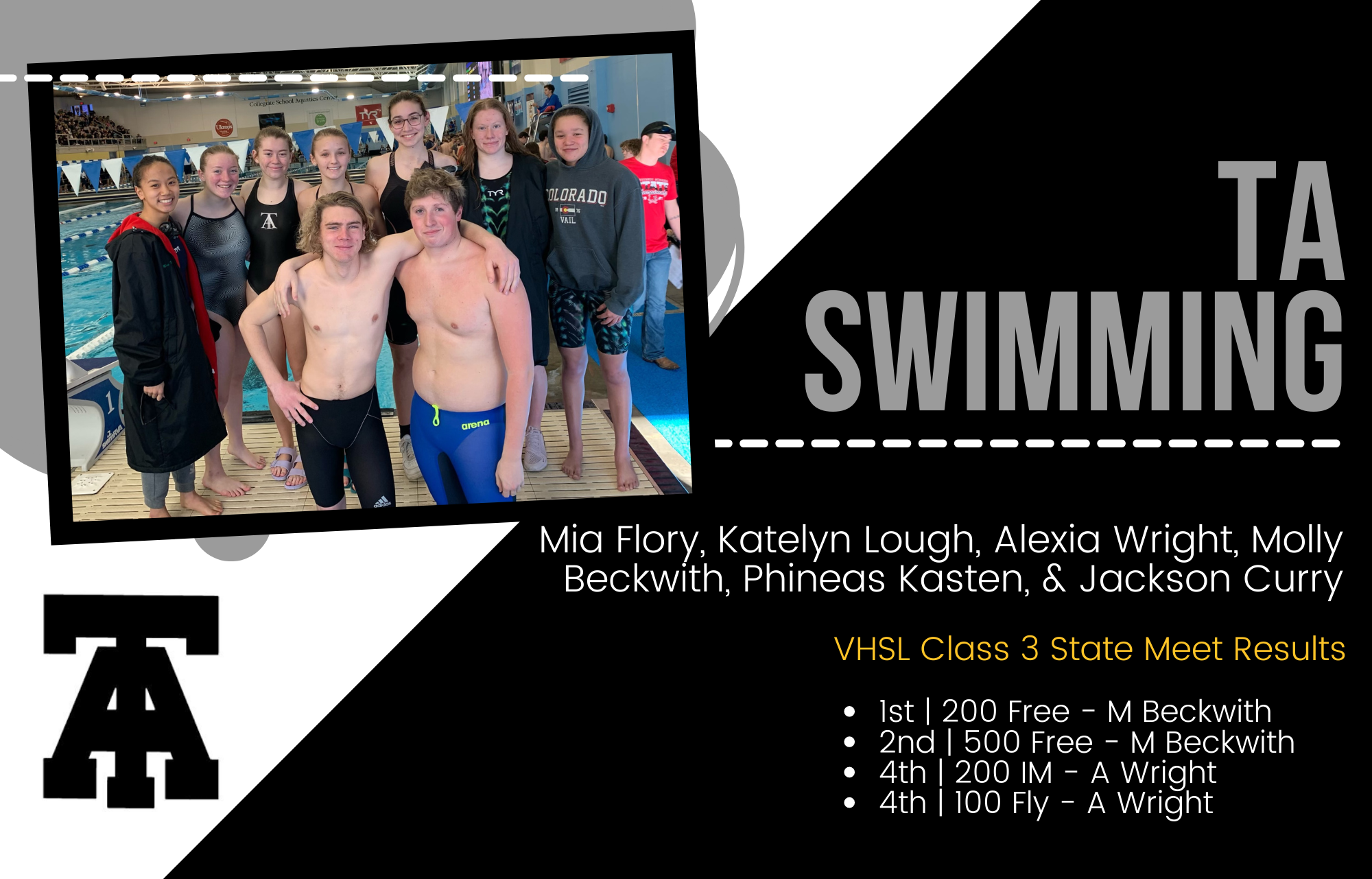 Turner Ashby High School was represented by Mia Flory, Katelyn Lough, Alexia Wright, Molly Beckwith, Phineas Kasten, & Jackson Curry. The * next to a name notes a personal best times for swimmers competing in the VHSL Class 3 State meet.