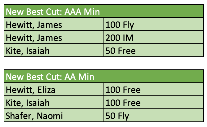 There were additionally 6 motivational cuts achieved - 3 AAA and 3 AA. Those swims and swimmers are called out below.