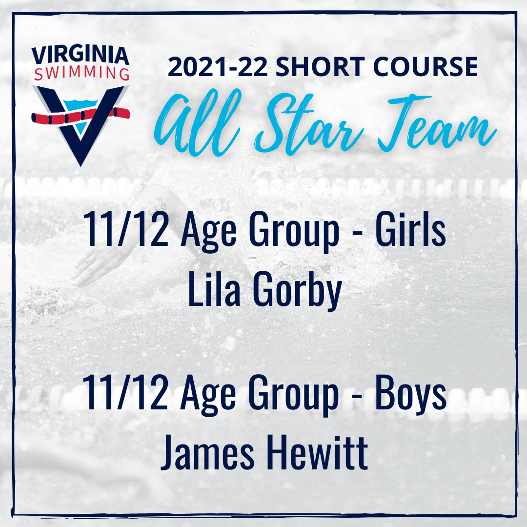 Virginia Swimming has shared the compilation of top ten swims for each age group and stroke. Two of our Harrisonburg Gator swimmers were named as part of the 2022 Virginia Swimming Short Course All Star Team: Lila Gorby and James Hewitt. To qualify, swimmers must finish the season with one of the top 5 fastest times in the LSC in any event in their age group.