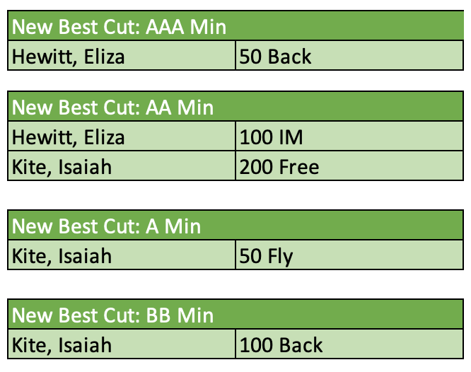 There were 5 new motivational cuts achieved from BB through AAA. Those swims and swimmers are called out below. Congratulations, everyone. What a great way to wrap up the end of the 2022 year - and a strong start as we head into the end of the short course season!