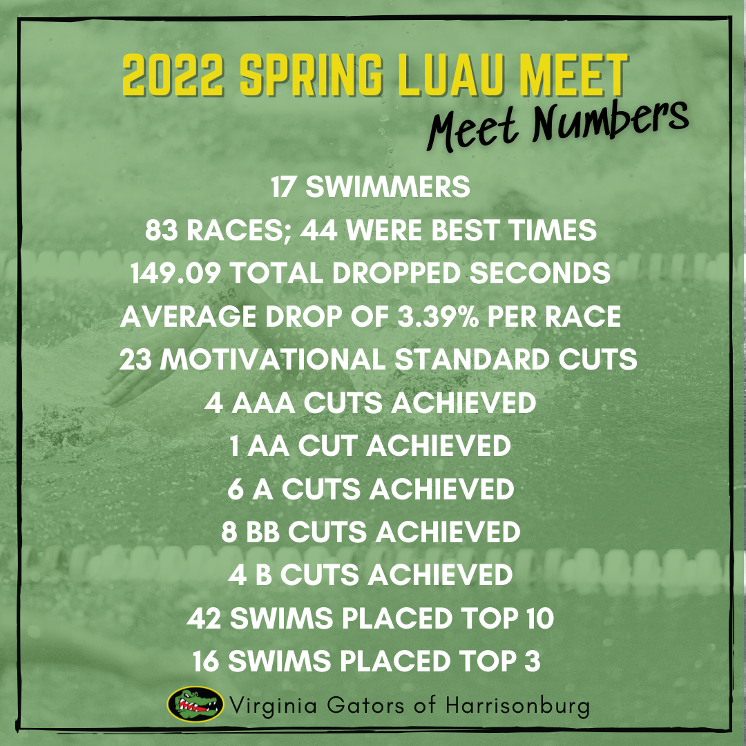 Seventeen of our swimmers traveled to Richmond from May 20 - May 23, 2022 for the 2022 CGBD Spring Luau long course meet held at Collegiate Aquatic Center in Richmond.