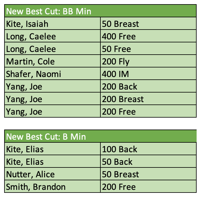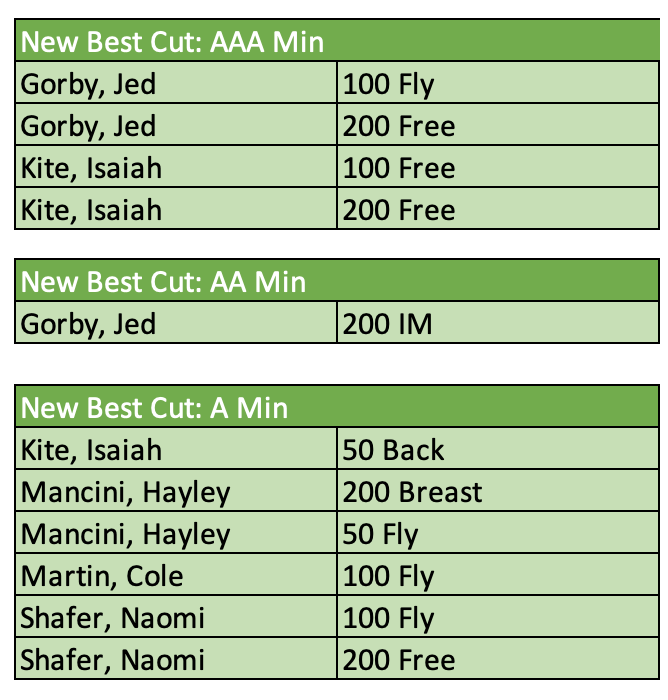 There were 23 motivational cuts achieved as well from AAA through B. Those swims and swimmers are called out below. You all did AMAZING!