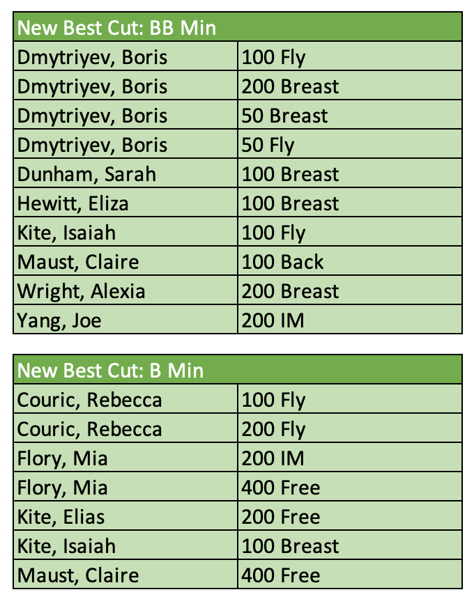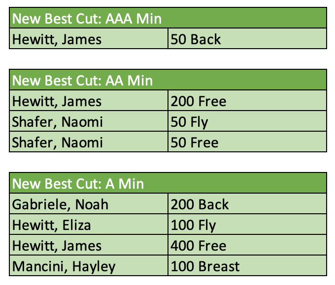 There were 25 new motivational cuts achieved from B through AAA. Those swims and swimmers are called out below. Great job to all of our swimmers!