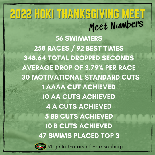 From November 11-13, fifty-six of our swimmers traveled to Christiansburg, VA for the HOKI Thanksgiving Invitational. This was a short course meet held at the Christiansburg Aquatic Center - and one of the largest we've been to in the last several years. Our team swam a total of 258 events over the course of 3 days, 21 of these races were first time swims, and 92 were best times. In addition, a total of 348.64 seconds were dropped!