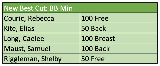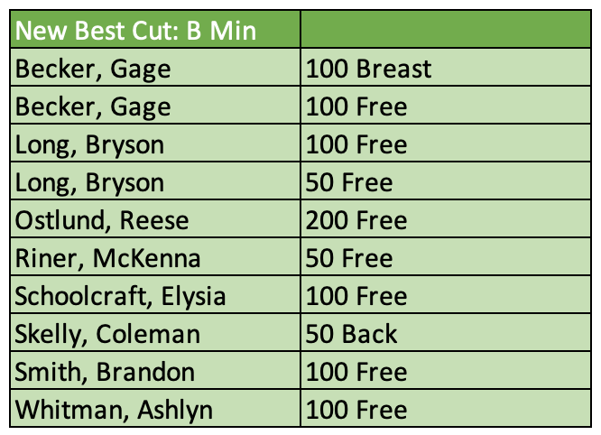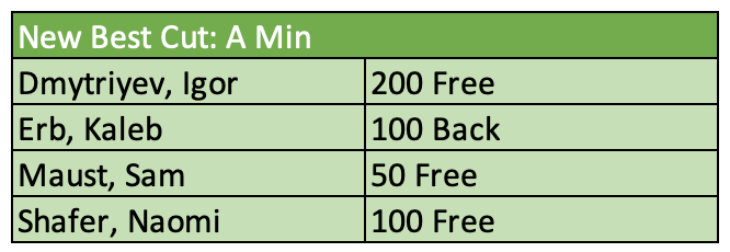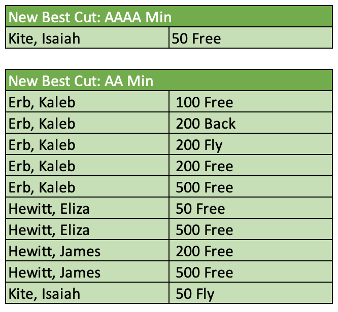 There were 30 new motivational cuts achieved from B through AAAA. Those swims and swimmers are called out below. Great meet, everyone!! We hope you all had fun and were encouraged by your times over the course of the weekend.