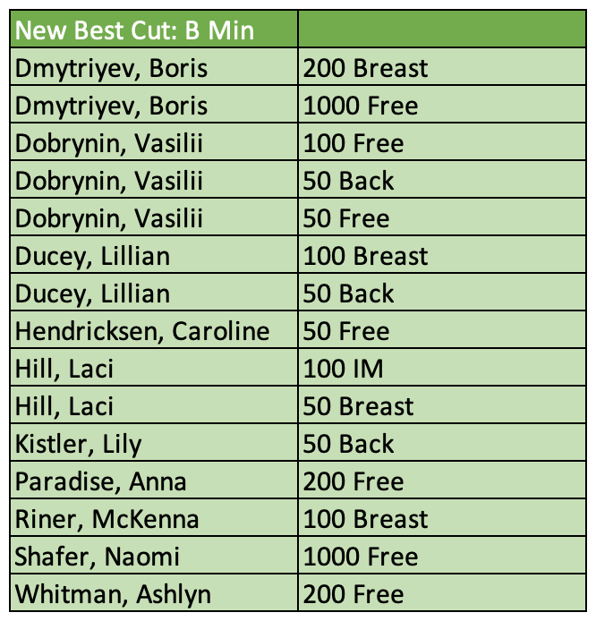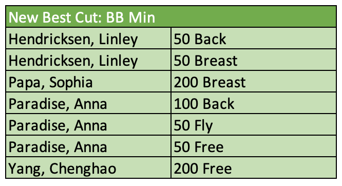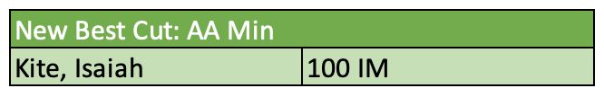 There were 24 new motivational cuts achieved from B through AA. Each of those swimmers and events are called out below. Great job everyone!
