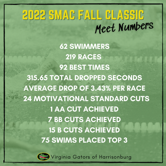 From November 19-20, sixty-two of our swimmers traveled to Waynesboro, VA for the SMAC Fall Classic. This was a short course meet held at the Waynesboro YMCA - and especially nice since it's close to home! Our team swam a total of 219 events over the course of 2 days, 56 of these races were first time swims, and 92 were best times. In addition, a total of 315.65 seconds were dropped!