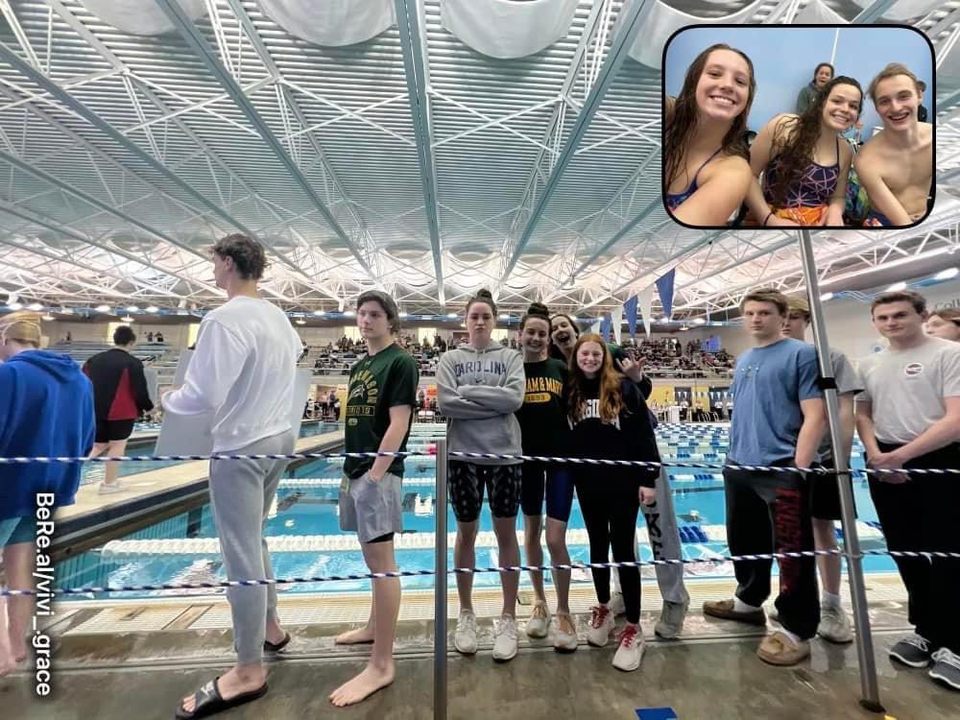 Seven of our swimmers are graduating seniors this year, so they were honored during the Senior Walk. Pictures from deck were otherwise fairly scarce, so a quick snapshot of a BeReal moment is about the best we can do (some of you will know what that is)!