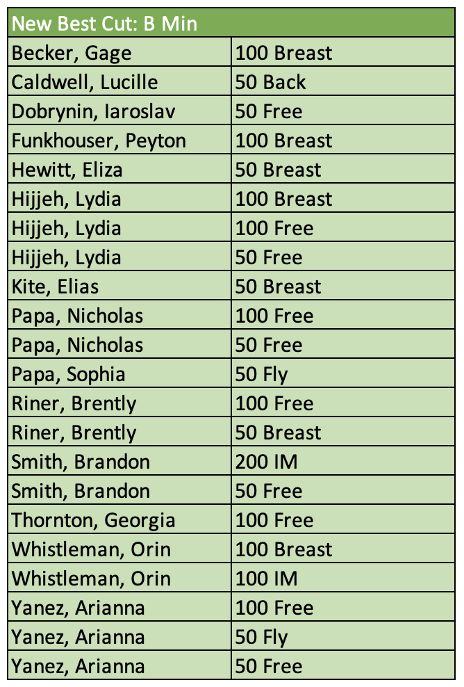 There were thirty-eight motivational cuts achieved as well from B through A (find the motivational cut standards here). Those swims and swimmers are called out below. You all did a great job and congratulations to those who had their first swims as Gators!