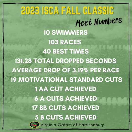 In November our team traveled to Hampton, Virginia with the Roanoke, Virginia coaches to attend the ISCA Fall Classic. This was a short course meet held at the Hampton Aquatic Center. Our ten swimmers swam a total of 103 events over the course of 3 days and 40 swims were best times, with a total of 131.28 seconds dropped.