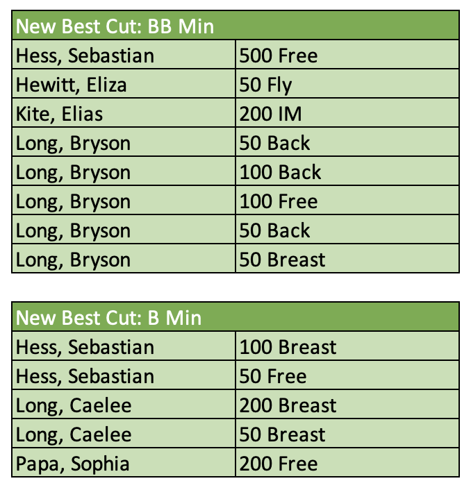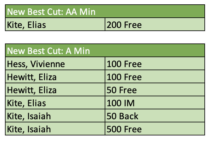 There were 19 new motivational cuts achieved from B through AA. Those swims and swimmers are called out below. Great meet, everyone!! We hope you all had fun and were encouraged by your times over the course of the weekend.