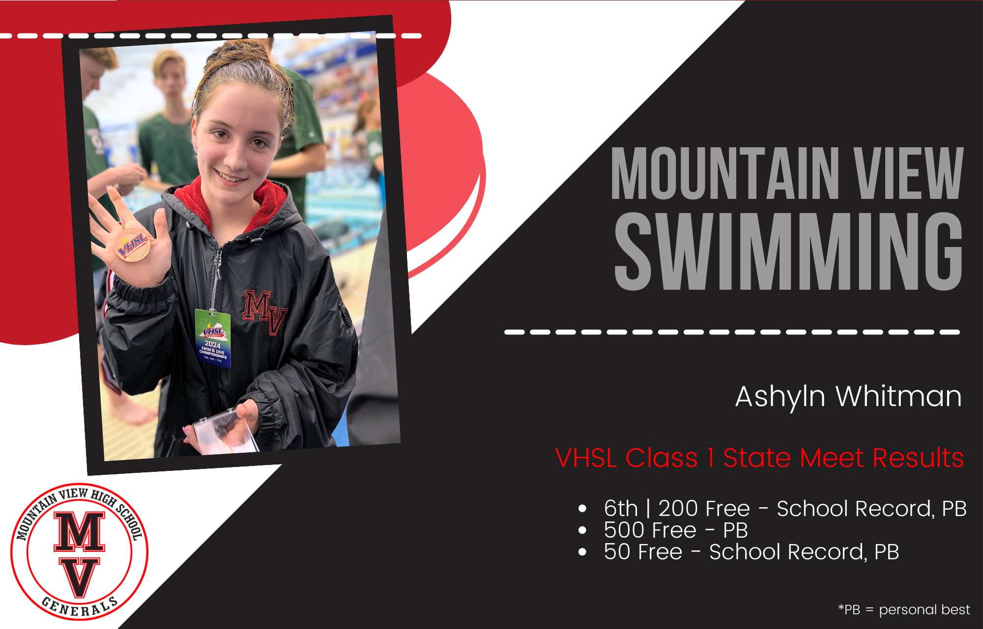Ashlyn Whitman represented Mountain View High School at the VHSL Class 1 State meet. She had personal best times for both of her events and also placed in the top eight in the 200 Free. She was also the lead off in the 200 Free Relay, where she had a personal best time in her 50 Free. Both her 200 Free and her 50 Free times set school records!