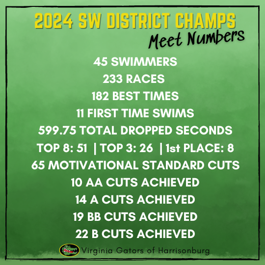 This year we had forty-six of our 9 & older swimmers compete in the 2024 SW District 9/Older Championship meet in Christiansburg. We had two FIRST TIME swimmers in the water, one senior swimming her final meet of her swim career, and a whole lot of swimmers working toward personal best times as well as making both USA Swimming motivational cuts and last minute Age Group Champs qualifying times.