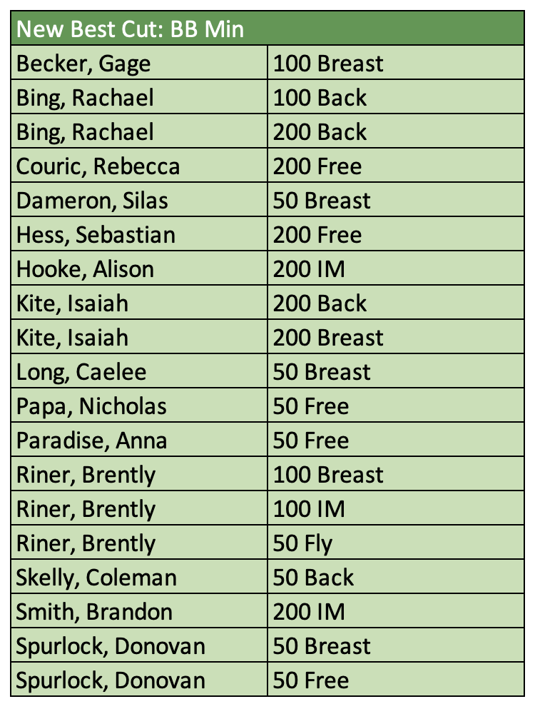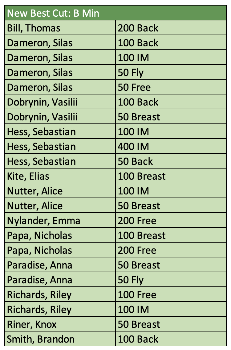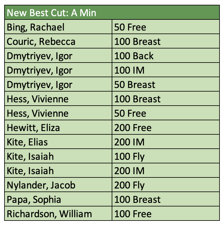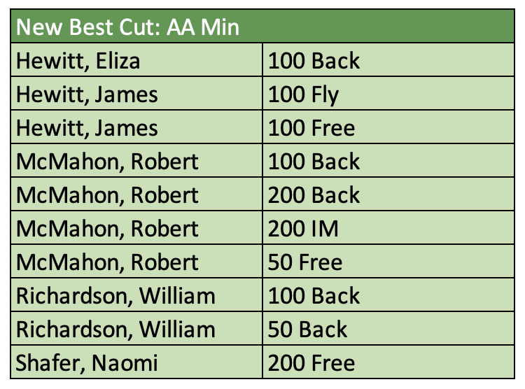 There were 65 motivational cuts achieved from AA through B. Those swims and swimmers are called out below. In addition, there were 22 age group or senior champs qualifying times. Motivational tags will be handed out by coaches soon. You all did AMAZING!