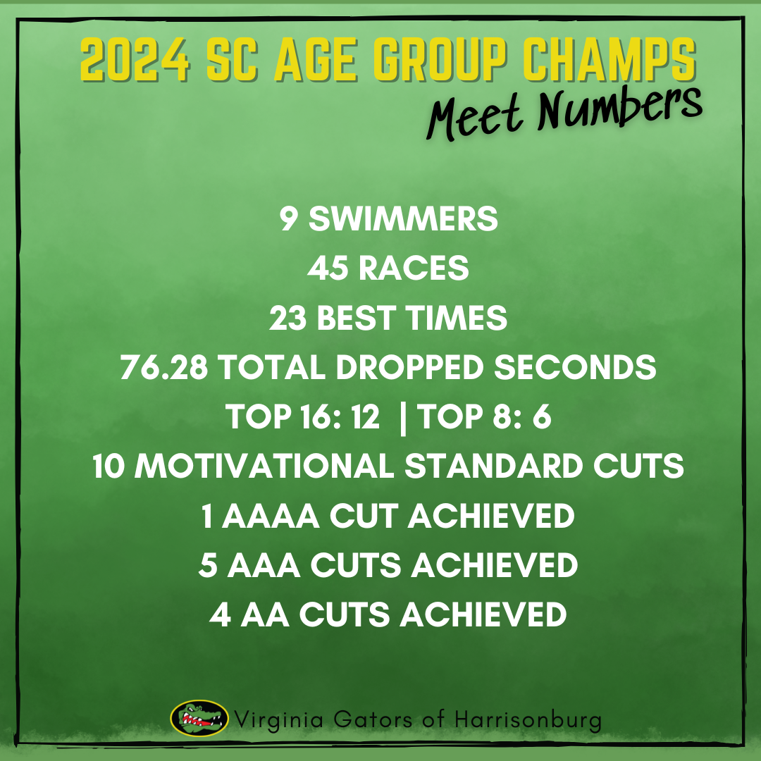 Nine of our 14/younger swimmers competed at the 2024 Virginia Swimming Short Course Age Group Championship meet in Christiansburg, VA from March 7 - March 10, 2024. This was a qualifying meet, so each of our swimmers earned cuts from the following time standards.