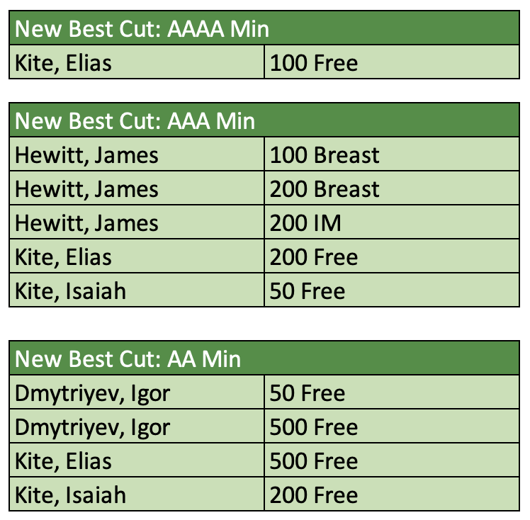 Additionally, there were 10 motivational cuts achieved - 1 AAAA, 5 AAA, and 4 AA. Those swims and swimmers are called out below.
