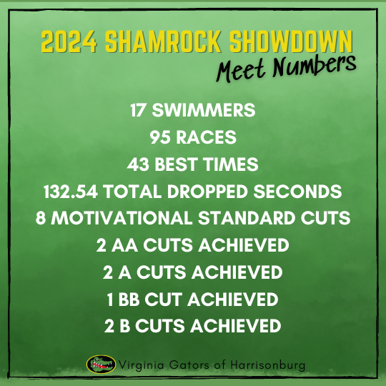 From March 22-24, seventeen of our swimmers traveled to Richmond, VA to attend the Shamrock Showdown. Our team swam a total of 95 events at this prelims/finals meet over the course of 2 days, and 43 were best times. In addition, a total of 132.54 seconds were dropped!