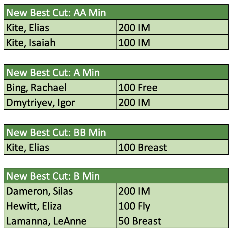There were 8 new motivational cuts achieved from B through AA. Each of those swimmers and events are called out below. Great job everyone!