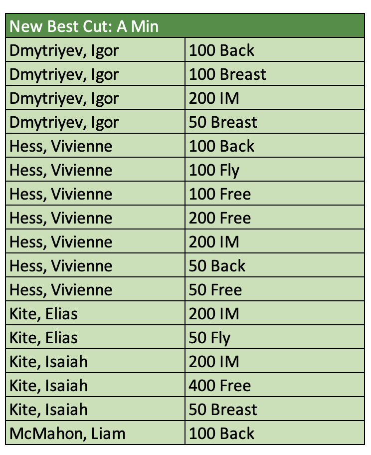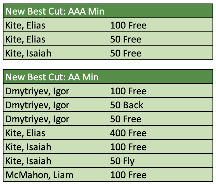 There were 32 motivational cuts achieved as well from AAA through B. Additionally, there were two new Age Group Champs cuts achieved. Those swims and swimmers are called out below. You all did AMAZING!