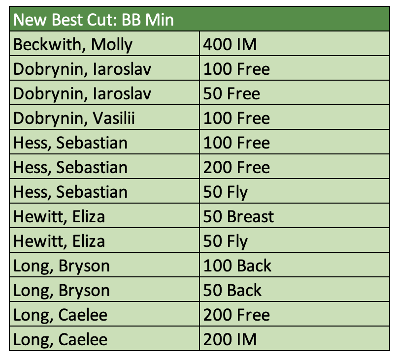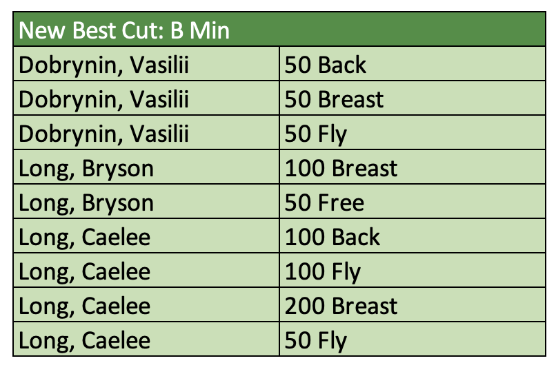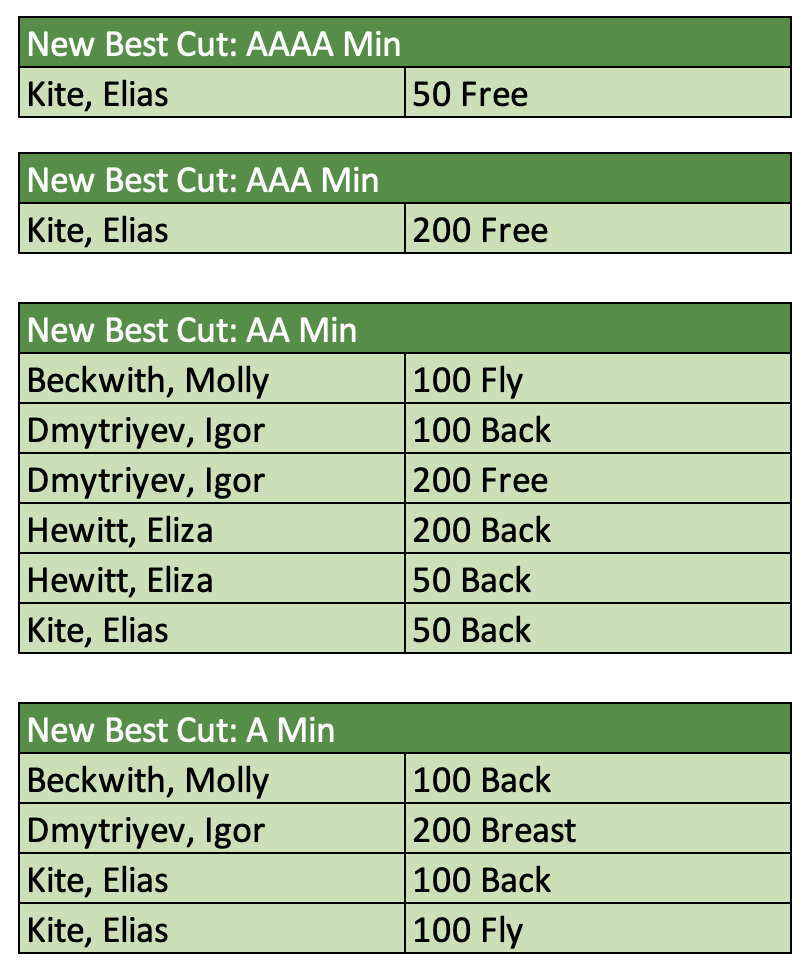 There were 34 new motivational cuts achieved from B through AAAA. Each of those swimmers and events are called out below. Great job everyone!