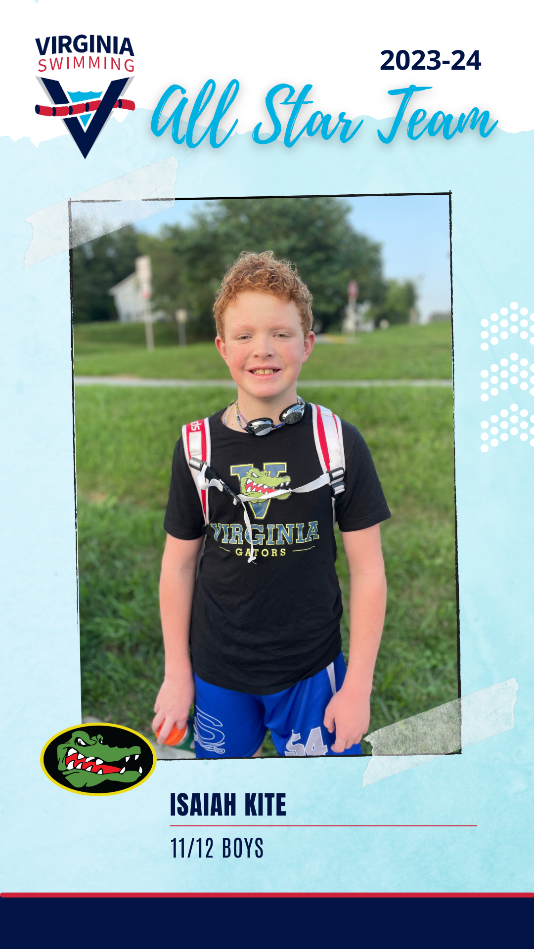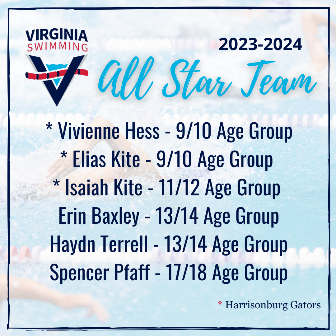 Three of our Harrisonburg Gators were named as part of the 2023-24 Virginia Swimming All Star Team list: Elias Kite, Vivienne Hess, and Isaiah Kite. To qualify for the All Stars team, swimmers must finish the season with one of the top 5 fastest times in the LSC in any event in their age group. (*Harrisonburg Gators)