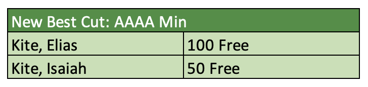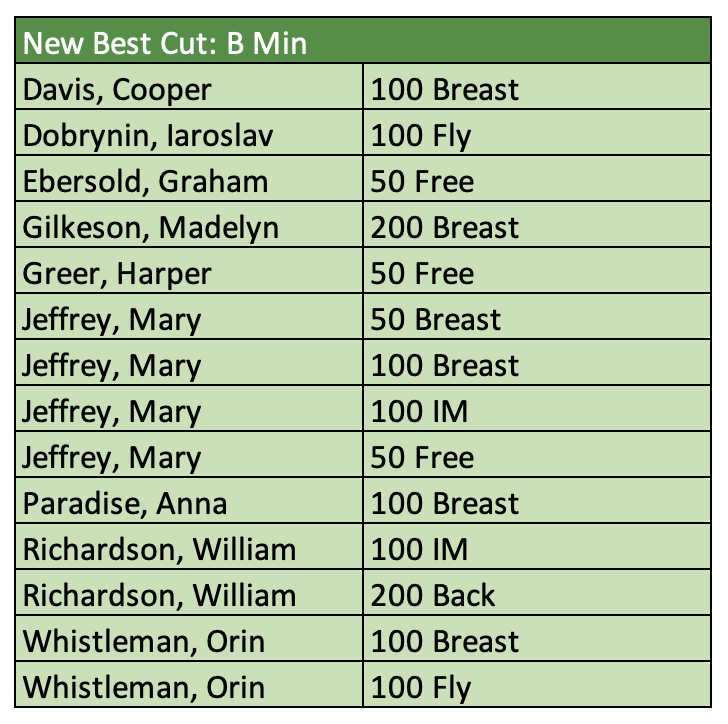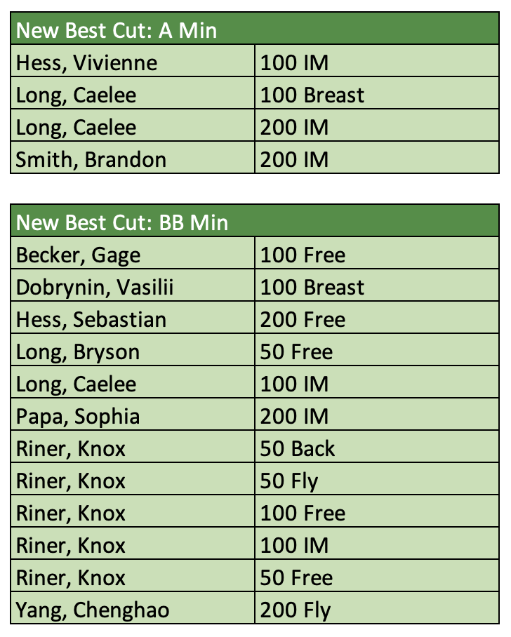 There were 32 new motivational cuts achieved from B through AAAA. Those swims and swimmers are called out below. Keep up the great work!