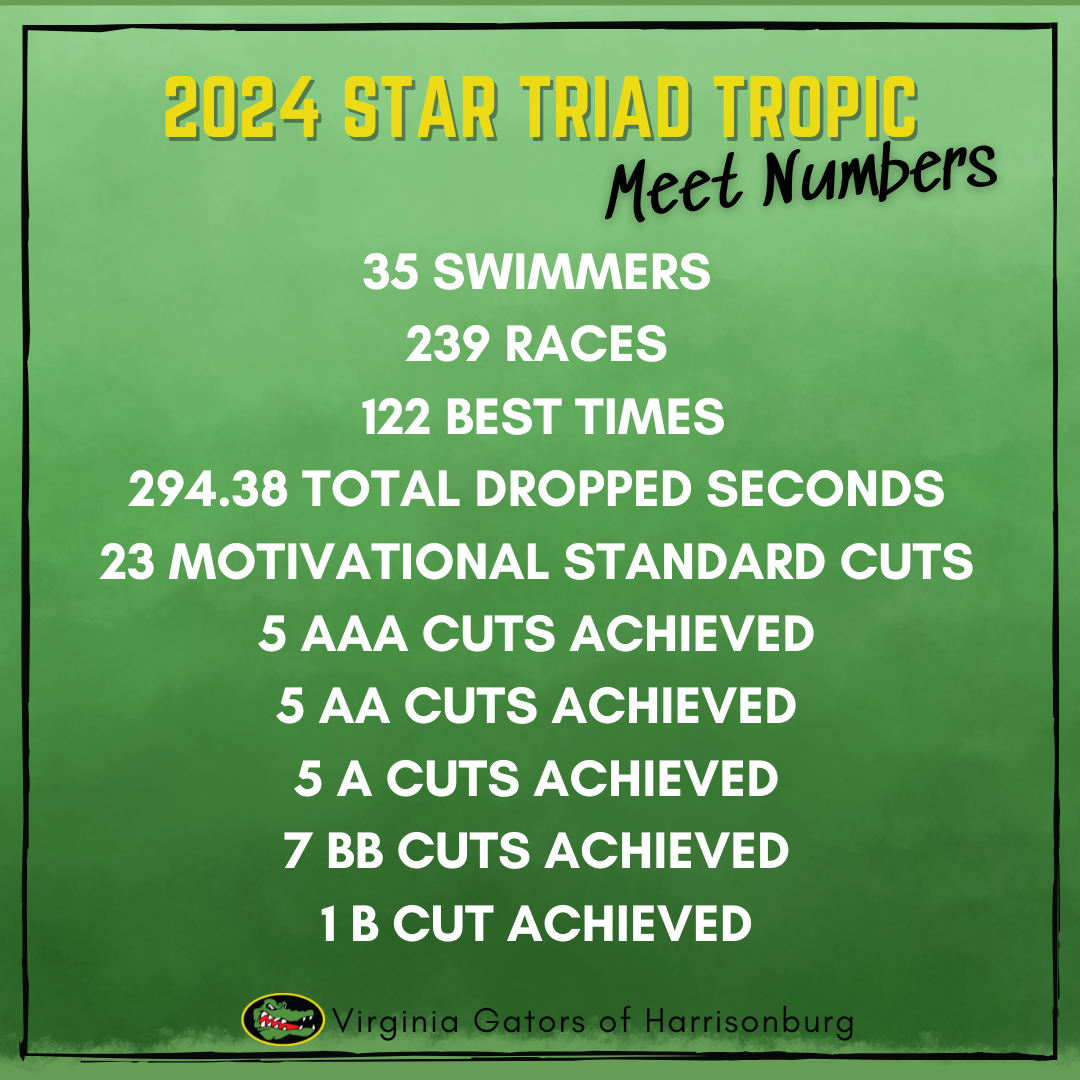 From December 20-22, thirty-five of our swimmers made the trip to Greensboro, NC, along with the Roanoke team, for the 2024 STAR Triad Tropic held at the Greensboro Aquatic Center.