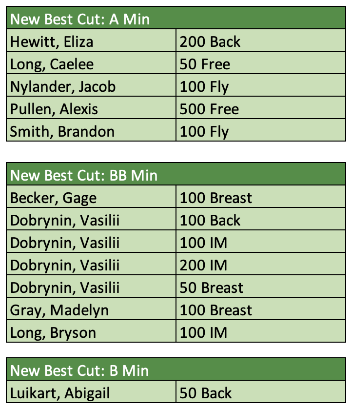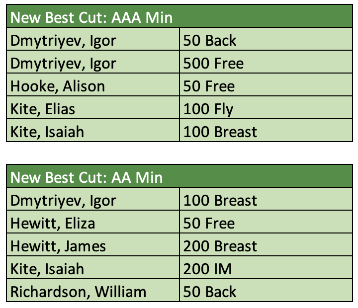 There were 23 new motivational cuts achieved from B through AAA. Those swims and swimmers are called out below. Keep up the great work!