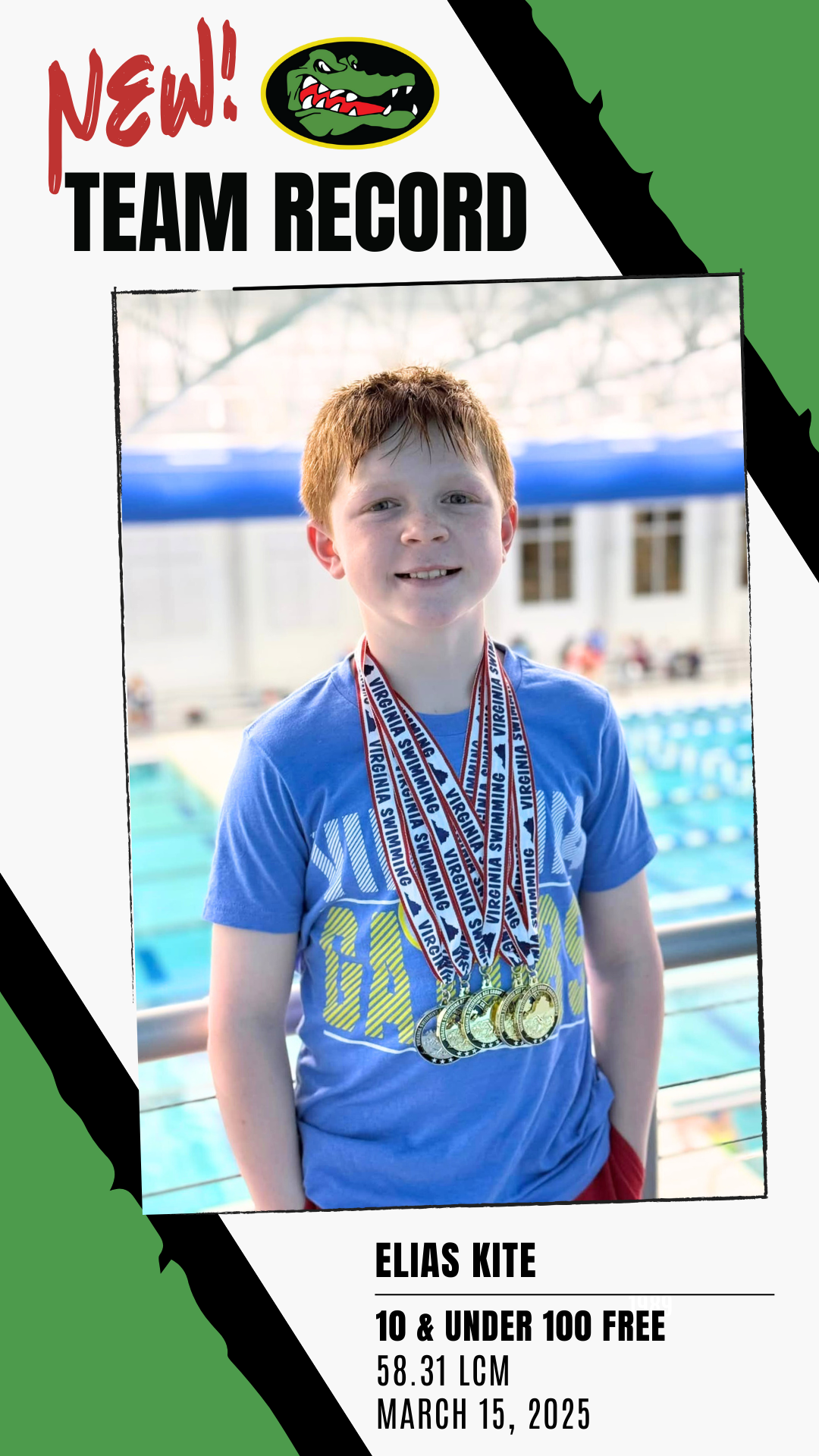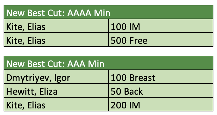In addtion to five new motivational cuts that were achieved, one of our swimmers, Elias Kite, broke the Gators 10/under 100 Freestyle record that was previously set in 2001. New motivational cuts achieved and swimmers are called out below.